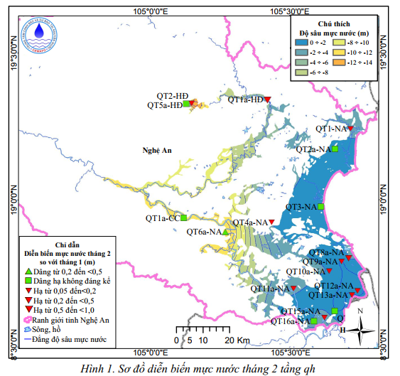 Diễn biến mực nước dưới đất trung bình tháng 2 so với cùng thời điểm 1 năm, 5 năm và 10 năm trước cho thấy mực nước suy giảm lớn nhất lần lượt là 1,00m; 1,46m và 2,00m tại phường Hạc Thành, phường Tân Dân và xã Xuân Hoà.