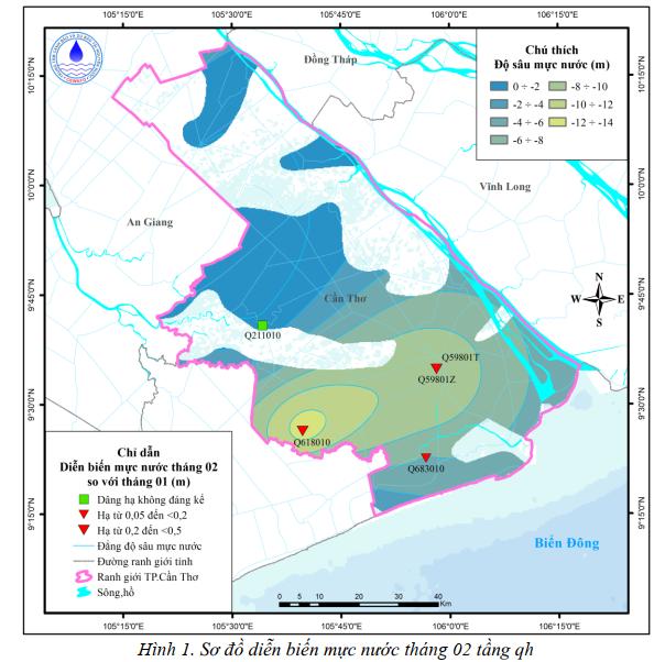 Diễn biến mực nước dưới đất trung bình tháng 2 so với cùng thời điểm 1 năm, 5 năm và 10 năm trước cho thấy mực nước suy giảm lớn nhất lần lượt là 1,67m; 1,75m và 2,32m tại phường Hạc Thành và xã Thọ Xuân.