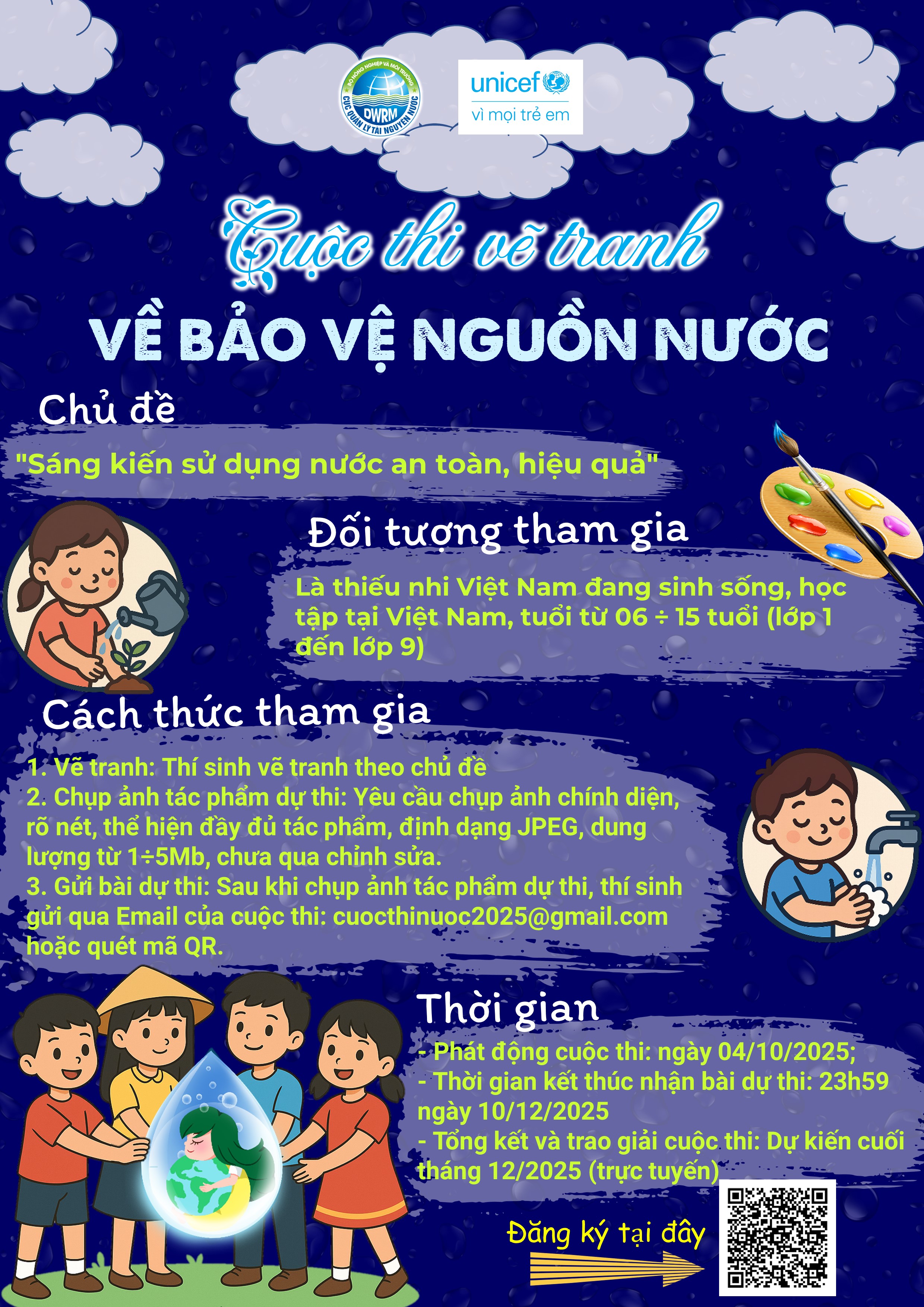 Nhằm góp phần nâng cao nhận thức cộng đồng, đặc biệt là thế hệ trẻ – những người sẽ quyết định tương lai của hành tinh, Cục Quản lý tài nguyên nước (Bộ Nông nghiệp và Môi trường) phối hợp cùng Quỹ Nhi đồng Liên hợp quốc (UNICEF) tại Việt Nam phát động cuộc thi vẽ tranh “Sáng kiến sử dụng nước an toàn, hiệu quả” trên phạm vi toàn quốc từ 04/10 đến 15/11/2025.