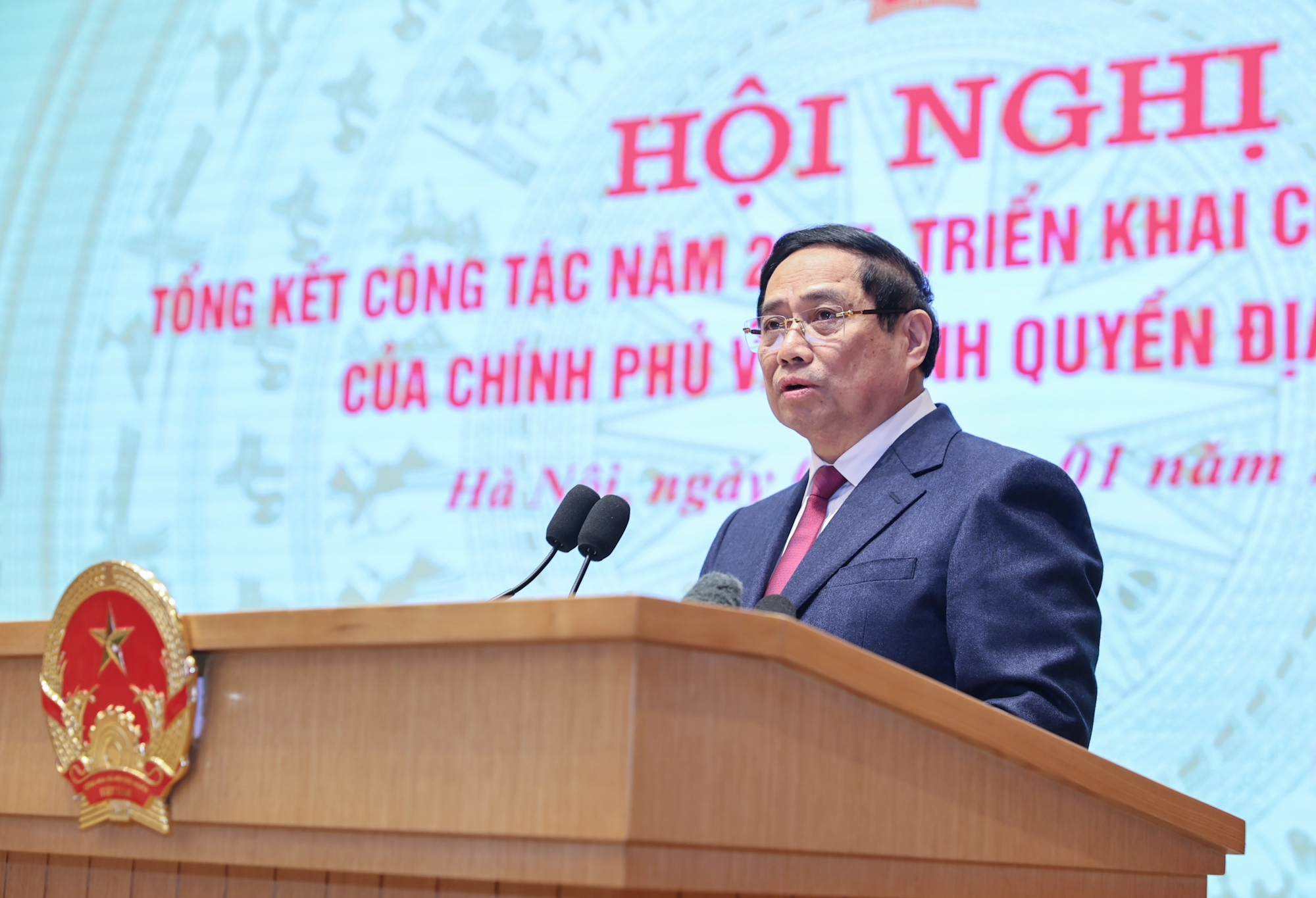 Tổng Bí thư Tô Lâm, Chủ tịch nước Lương Cường, Thủ tướng Chính phủ Phạm Minh Chính, Chủ tịch Quốc hội Trần Thanh Mẫn tới dự Hội nghị toàn quốc Chính phủ và chính quyền địa phương - Ảnh: VGP/Nhật BắcPhát biểu khai mạc trong không khí phấn khởi của những ngày đầu năm mới 2026, cả nước thi đua lập thành tích chào mừng Đại hội lần thứ XIV của Đảng, thay mặt Chính phủ, Thủ tướng Phạm Minh Chính nhiệt liệt chào mừng và trân trọng gửi tới Tổng Bí thư Tô Lâm, các đồng chí lãnh đạo chủ chốt, lãnh đạo Đảng, Nhà nước và toàn thể đại biểu lời cảm ơn chân thành, lời chào trân trọng, lời thăm hỏi ân tình và lời chúc mừng tốt đẹp nhất.