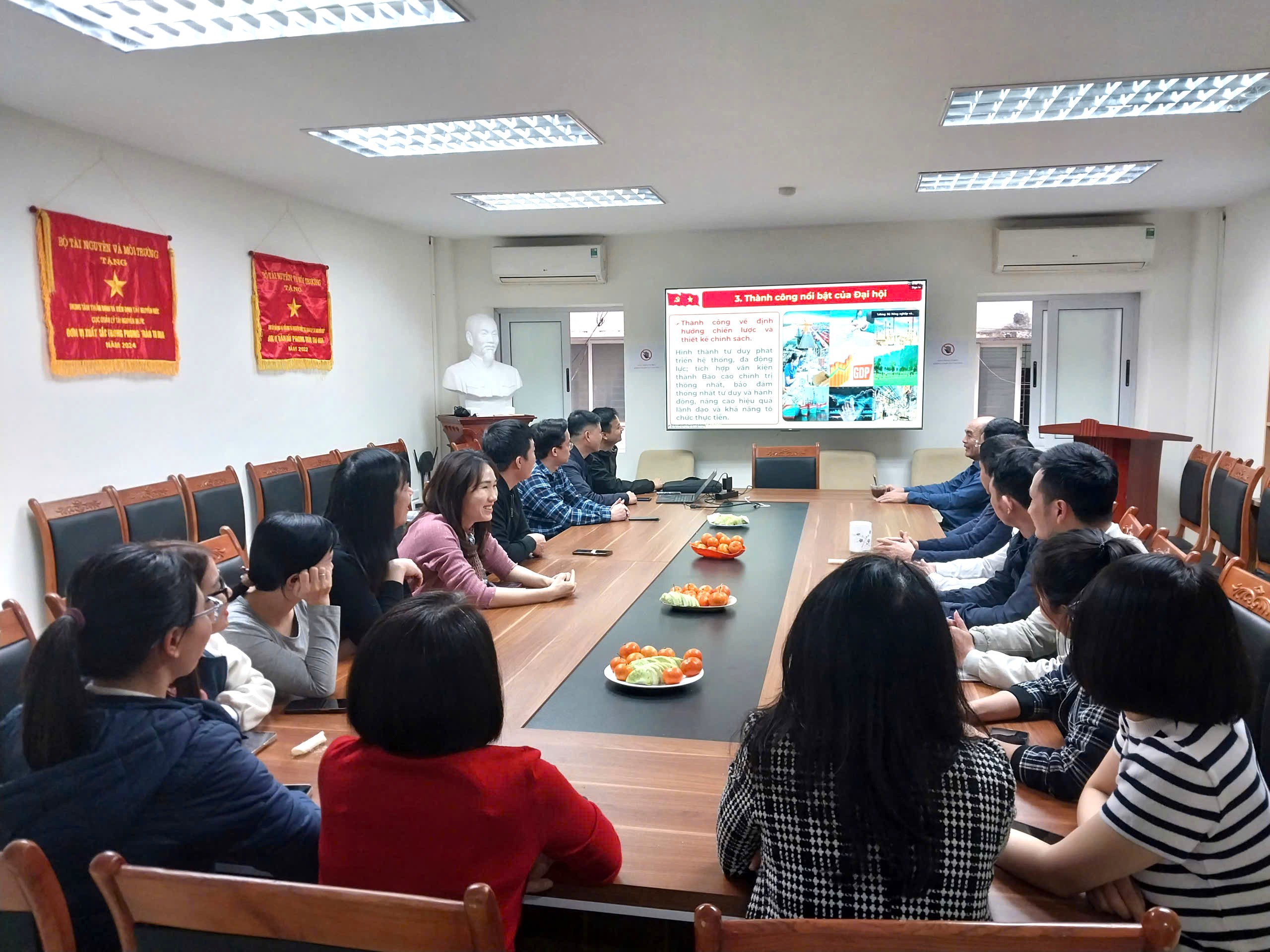 Hơn 100 cán bộ, đảng viên thuộc Đảng ủy Bộ Nông nghiệp và Môi trường tham dự Hội nghị tại trụ sở. Ảnh: Kiều Chi.Tại điểm cầu trụ sở Cục Quản lý tài nguyên nước, tham dự hội nghị có các đồng chí Ủy viên Ban Thường vụ Đảng bộ Cục, Ủy viên Ban Chấp hành Đảng bộ Cục; Bí thư, Phó Bí thư các chi bộ trực thuộc cùng toàn thể cán bộ, đảng viên đang sinh hoạt tại các chi bộ thuộc Đảng bộ Cục.