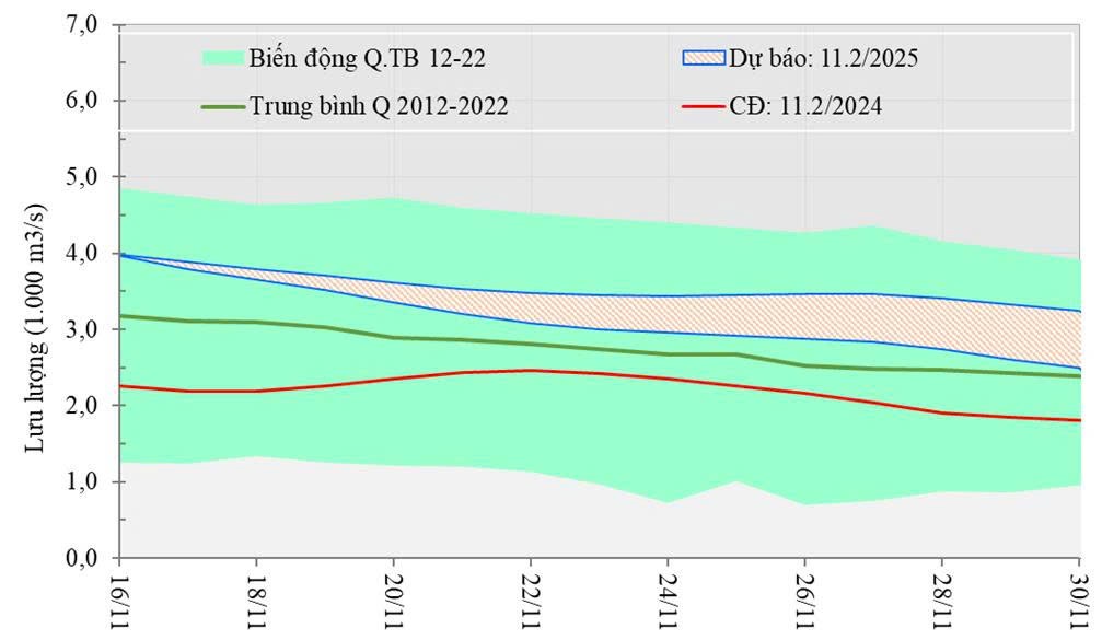 Tổng lượng dòng chảy qua trạm Chiềng Sẻn trong nửa đầu tháng 11/2025 đạt 4,0 tỷ m3, cao hơn so với giá trị TBNN và cùng kỳ năm 2024 lần lượt là 60% và 54%.