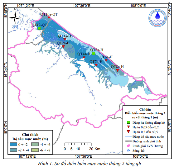 Trong tháng 2: Mực nước trung bình tháng nông nhất là -0,46m tại xã Phú Hồ, TP Huế (QT3a-H) và sâu nhất là -3,24m tại phường Phong Thái, TP Huế (QT2a-H). Diễn biến mực nước dưới đất trung bình tháng 2 so với cùng thời điểm 1 năm, 5 năm trước cho thấy mực nước hạ thấp nhất lần lượt là 0,48m và 0,31m tại xã Vĩnh Lộc TP Huế.