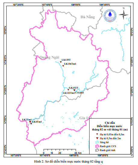 Diễn biến mực nước dưới đất trung bình tháng 02 so với tháng 01 có xu thế hạ, có 8/8 công trình mực nước hạ. Giá trị hạ thấp nhất là 0,96m tại xã Ia Tơi, tỉnh Quảng Ngãi (LK2Tm1).