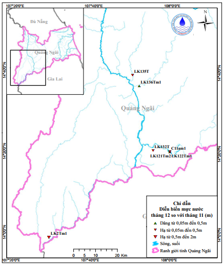 Trong phạm vi tỉnh, mực nước trung bình tháng 12 có xu thế hạ so với tháng 11. Giá trị hạ thấp nhất là 1,35m tại xã Vạn Tường (QT1-QN). Mực nước trung bình tháng nông nhất là -6,14m tại xã Vạn Tường (QT1-QN) và sâu nhất là -12,51m tại xã Ia Chim (LK130T). Trong tháng 01 và tháng 02 năm 2026 mực nước có xu thế hạ, mực nước hạ từ m đến 0,01m đến 2,02m.