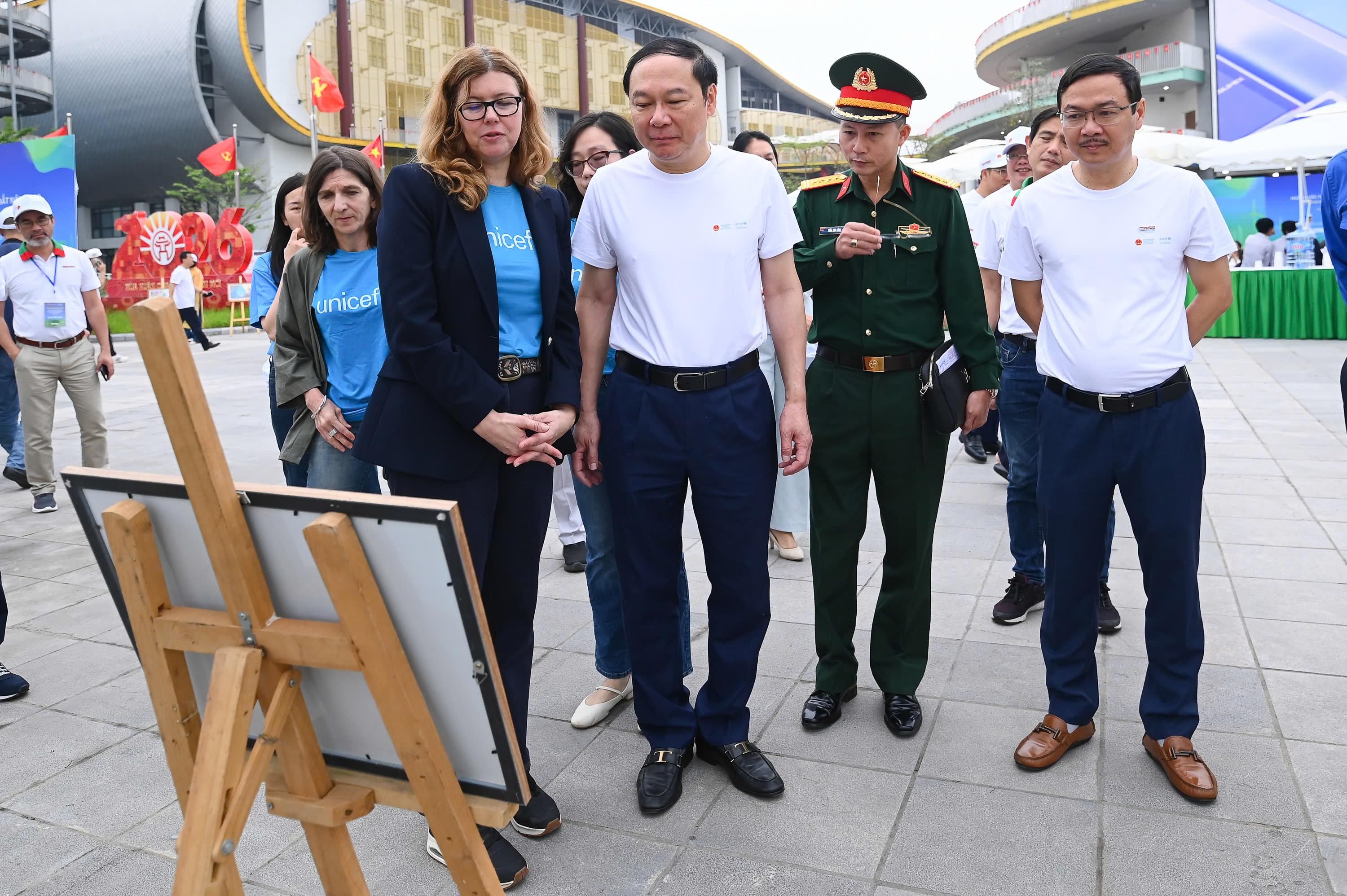 Thứ trưởng Lê Công Thành và bà Silvia Danailov, Trưởng đại diện UNICEF tại Việt Nam tham quan triển lãm tranh, chủ đề: “Sáng kiến sử dụng nước an toàn, hiệu quả” bên lề sự kiện.